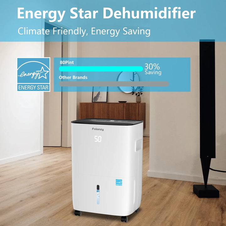 About this item 1.POWERFUL DEHUMIDIFICATION:Our dehumidifier can remove up to 80 pints of moisture per day at saturation (under 89°F,95%RH condition) and reduce humidity from 80% to 30%. This dehumidifier is ideal for spaces up to 5200 sq. ft,such as basements, garage,home, office,cellars,crawlspace, bathroom, bedroom,laundry room,stockroom and any large room. 2.SAVING ON BILLS: Folanzy smart dehumidifier for home received the ENERGY STAR Certified 2024, quickly and effectively removes moisture with less energy than conventional dehumidifiers without racking up the energy bill, saving money. 3.SMART CONTROL: With the Smart App, set schedules according to your needs, and easily customize humidity(such as turn on/off, set ideal humidify, 24h timer,adjust fan speed and modes.) for your family anytime and anywhere. 4.PORTABLE DRAINAGE: This professional dehumidifier comes with 3.3ft drain hose for continuous draining. If you think the hose is not long enough, - It can also connect to the garden hose(Buy Separately). 5.LARGE CAPACITY: With a sizable water tank,the 1.14 gallon bucket is full,it will auto stop,don't need to worry about leaking. 6.HUMANIZED FEATURES: Smart APP,optional 4 modes(Sleep Mode,Living Mode,Basement Mode and Continuous Mode),adjustable fan speeds, 24-hour timer,built-in 360° wheels and handle,auto restart and defrost,low-noise,power outage restart,child lock and removable washable filter. 7.CUSTOMER SUPPORT: With over 10 years of experience manufacturing high-quality dehumidifiers,it is covered with 30 Days Money Back if you are not satisfied with the product, 2 years Protection(See user manual for detail) and lifetime expert tech support. You can try our product without hesitation,please feel free to contact us if there is any question,we will reply to you within 24 hours and help you solve any problem.