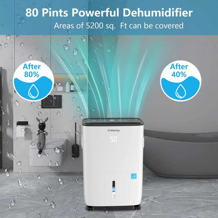 Folanzy 80 Pints Smart Dehumidifier for Home Basement Large Room Spaces up to 5,200 Sq. Ft with Drain Hose and Water Tank