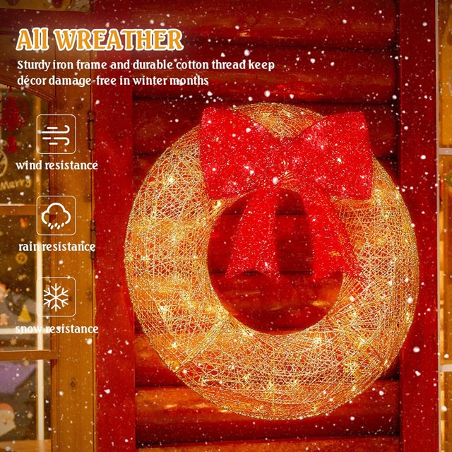 FOOWIN 48in Outdoor Christmas Wreath,Featuring 140 energy-efficient LED lights in classic Christmas colors (cool-to-touch and low-power), it easily transforms gates, garages, or walls. Enjoy quick, simple assembly (approx. 30 minutes) and all-weather durability thanks to its heavy wire frame and resistant glittery fabric. After the holidays, store it compactly by breaking it down to fit in your own bag or box.