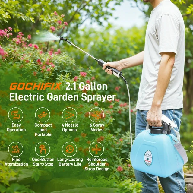 This electric sprayer revolutionizes gardening with 7.4V battery powered sprayer technology. The sprayer 2.11 gallon capacity (8L) paired with a 2000mAh battery sprayer runs 2 hours per charge, eliminating manual pumping. Perfect for sprayers in lawn and garden, its electric pump delivers strong spray for tall plants, covering large areas effortlessly. Ideal garden sprayer for daily tasks, saving labor and time with industrial-grade efficiency.💦【4 Adjustable Nozzles and 6 Spray Modes】💦