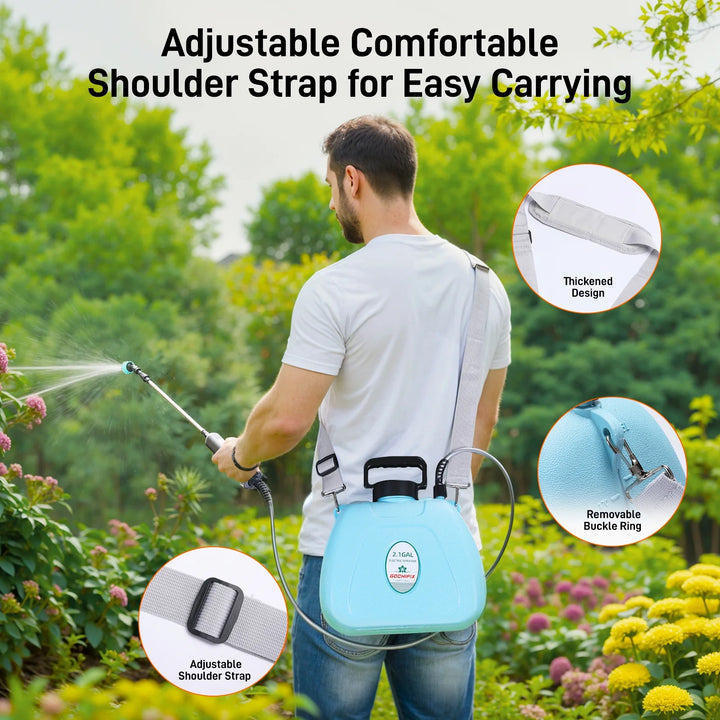 The garden sprayer has a capacity of 2.11 gallon, It is not have to run multiple times to refill water, reduce the workload. The 2.11 gallon sprayer can be hand-held and equipped with an adjustable shoulder strap for portability during long-term work. The water tank with scale markers, allowing you to easily see remaining solution amount for better organize work. Are you ready to take your work to the next level and start your gardening tour.🌿【Strong Spraying Machine】🌿