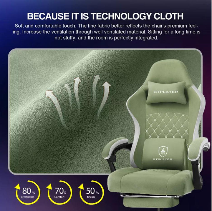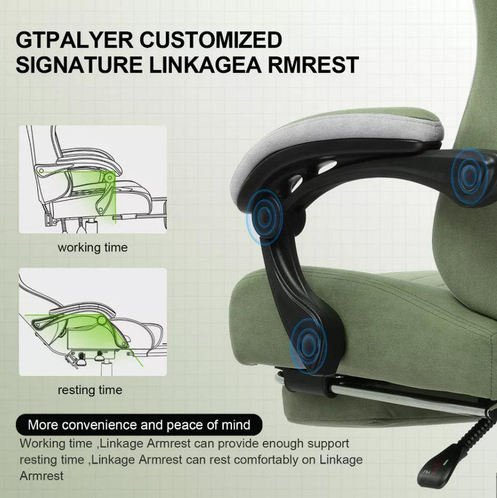 Choose the GTPLAYER Gaming Chair for unmatched comfort and style. Its unique see-through butterfly embroidery design and pocket springs provide excellent support, while breathable fabric and elastic polyurethane cushioning enhance your gaming experience. The chair features a 10 cm safety air pressure bar for effortless height adjustment and a step-free recliner for optimal relaxation. Crafted from recyclable polyurethane, it ensures a worry-free seating experience with no adhesives or formaldehyde concerns. The self-developed breathable fabric, enhanced with quilting technology, keeps you comfortable during long gaming sessions. Its simple design and refined color combinations seamlessly blend with any home decor, adding a touch of elegance. Additionally, the convenient interlocking armrests automatically adjust with the backrest angle, preventing elbow strain and allowing for easy position changes. Elevate your gaming setup with the GTPLAYER chair!