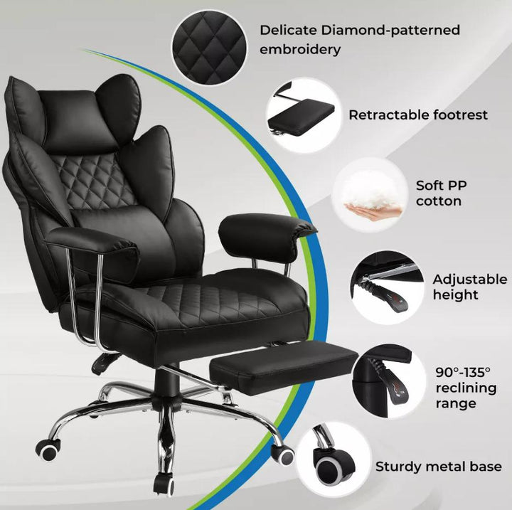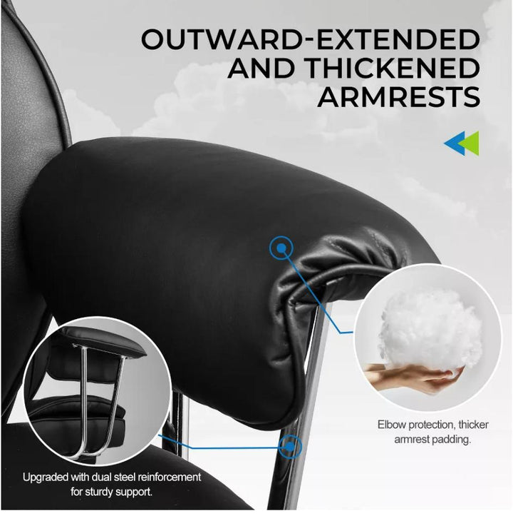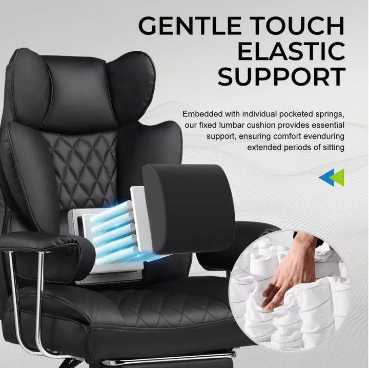 【Sofa-like Seat】 The executive chair features a pocket spring lumbar support for elasticity and heat dissipation during prolonged sitting. The widened seat, free of restricting side wings, along with an adjustable footrest, allows comfortable seating in any position. It's as casual and free as sitting on your own sofa.