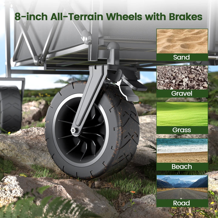 - Durable All-Terrain Wheels with Brakes: Equipped with four 8-inch heavy-duty all-terrain wheels, including two 360-degree rotating front wheels for easy maneuverability on surfaces like sand and gravel. The built-in anti-slip brakes provide added safety and stability, making it an effortless and secure companion for any environment.