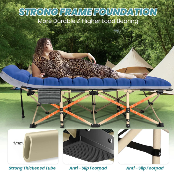 - Durable and Sturdy: There are camping canvas that can support 880 Ibs. The enhanced structure has 10 tube -shaped iron legs and 25mm thick flat -shaped square tubes to ensure uniformly distribution, making sleep stronger and more stable. A non -slip foot plastic block keeps the bed safe and stable in any terrain.