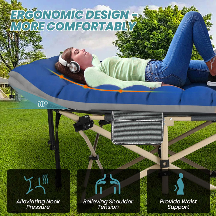 - Top 18 ° Tilting Ergonomic Design: 75 x 28 inch camping bed is an ideal sleeping bed for adults. The top of the bed is tilted for 18 °, making your head more comfortable when you lie down, and provide you with comfortable sleep. It can be used for camping, family spare beds and office, suitable for rest at night, sleeping at home and office rest.
