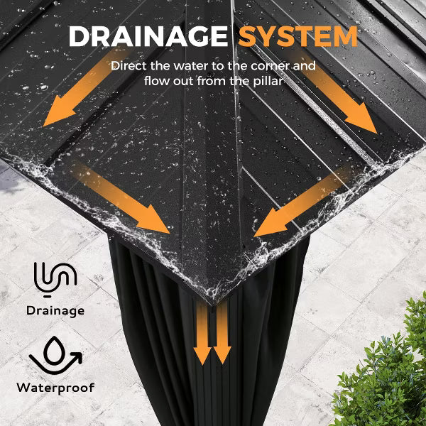 Double Galvanized Steel Roof & Enhanced Ventilation Features a heavy-duty double-layer galvanized steel roof for superior durability, weather resistance, and protection against intense sun, rain, and wind. Sturdy & Rust-Resistant Aluminum Frame Constructed with a premium rust-resistant aluminum frame that offers an ideal blend of lightweight portability and exceptional strength. It guarantees long-lasting stability and requires no maintenance, making it perfect for humid, rainy, or coastal environments. Stable Double-Top Design & Functional Hooks The innovative double-roof structure not only enhances air circulation but also significantly increases stability against strong winds. Built-in hooks at the center provide a convenient solution for hanging lights, plants, or other decorations to create your ideal ambiance. Versatile Netting & Curtains with Dual Rails Equipped with a dual rail system for effortless switching between removable mesh netting and privacy curtains. This offers flexible enclosure options. Spacious & Multi-Functional Outdoor Shelter This generously sized gazebo is designed as a versatile centerpiece for any outdoor space. It provides a stylish and sheltered area for barbecues, garden parties, poolside lounging, or quiet relaxation, seamlessly integrating into patios, decks, and lawns for year-round use.
