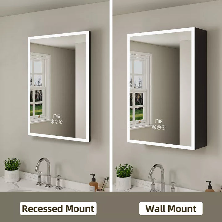 The HBEZON Medicine Cabinet seamlessly combines functionality with elegance, perfect for modern bathrooms. It supports both recessed and wall mounting, with all required accessories and a detailed installation guide included.Customize your lighting with 3 color temperatures (3000K, 4000K, 6000K) and dimmable brightness from 10% to 100%, with a memory function to save your preferences. An anti-fog feature keeps the mirror clear, while the time and temperature display offers convenient updates.