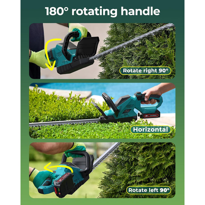 A 1000W pure copper motor drives the shrub trimmer working at the speed of up to 3000RPM and delivers faster and more efficient cuts. Cordless gardening tools feature 180° adjustable head for shaping hedges in tight areas. Thanks to the deep quenching process, it ensures smooth cutting. Suitable for elderly people and gardening beginner