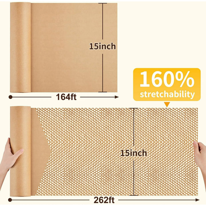 - Space Saving Honeycomb Packing Paper: This 15''x164' honeycomb cushioning wrap roll can stretch up to an impressive 160%. Lightweight, portable, and save space. 20 fragile sticker labels are provided to keep your boxes safe in transit.