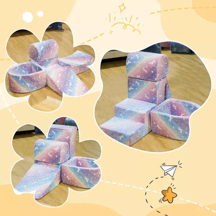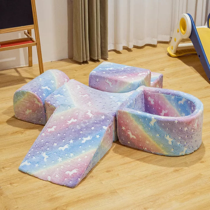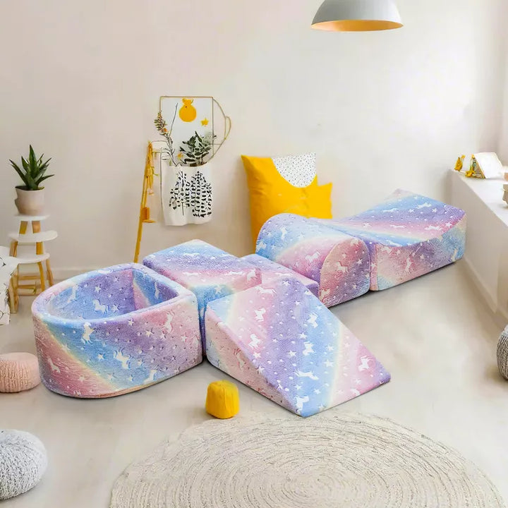 This 5-in-1 modular kids’ play sofa set combines climbing blocks (5 designs: slope, bassinet, arched bridge, gate pillar, and steps) — perfect for practicing crawling/walking, and also works as a cozy couch. The couch is made of soft, breathable faux fur and 28D foam — anti-static and pill-resistant. It comes with removable covers for easy cleaning when dirty. It also has a glow-in-the-dark feature: just “charge” it under light for 10-15 minutes to make it glow. The climbing blocks can be assembled into multiple shapes for various ways to play, fully boosting kids’ skills and imagination. Stylish and practical, it perfectly meets both play and rest needs.