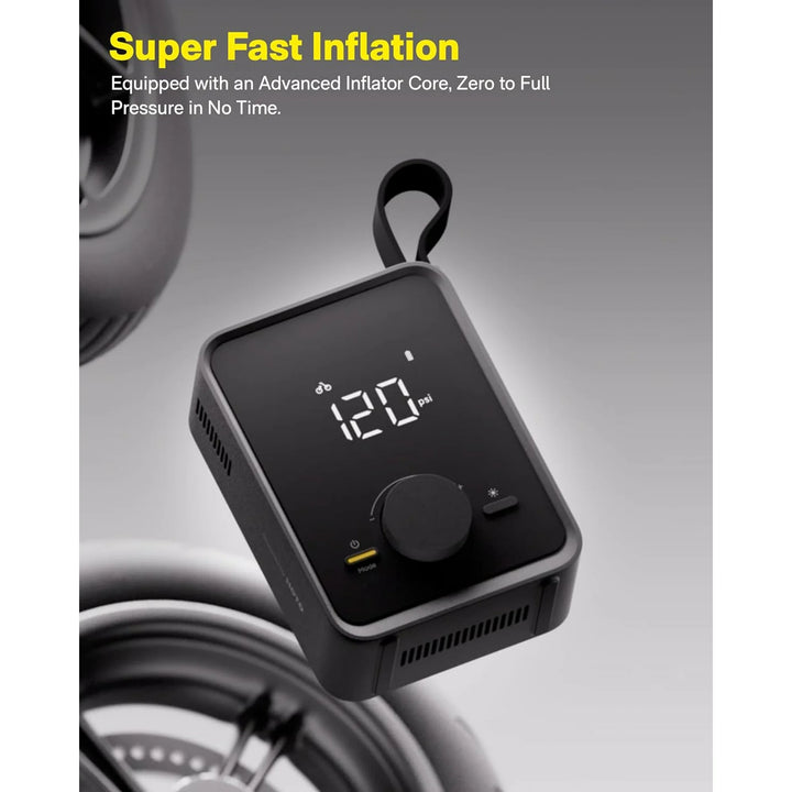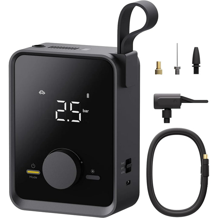 Your professional-grade inflation solution. This powerful device inflates car tires in just 5 minutes, boasting an 80% power increase over its predecessor. With a user-friendly LED display, smart pressure sensing, and a versatile 0-120 PSI range, it's perfect for vehicles, bikes, and more. The Air Pump Pro features a 70cm quick-connect hose, multiple nozzles, and a 2500mAh battery for extended use. Compact yet mighty, it's your reliable companion for swift inflation on any adventure.