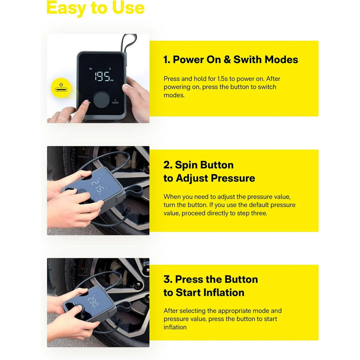 Powerful and precise, the HOTO Air Pump Pro is your ultimate companion for effortless inflation. This professional-grade device transforms tire maintenance from a chore into a breeze. With its lightning-fast inflation speed and intuitive interface, you'll be back on the road in no time.