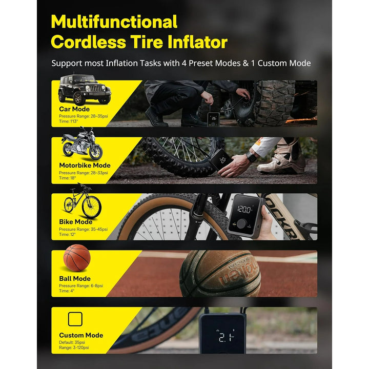 - Easy Control with Convenient Auto-stop: There are 4 inflation presets (Car - 36 psi, Motorcycle -35 psi, Bicycle - 45 psi, Ball - 8 psi) and 3 inflation units (kPa, psi, and bar), no need to worry about understanding air pressure. It automatically stops when it reaches the desired inflation value, ensuring accurate and reliable inflation. NOTE: Inflating a road bike, need to manually adjust the pressure in custom mode.