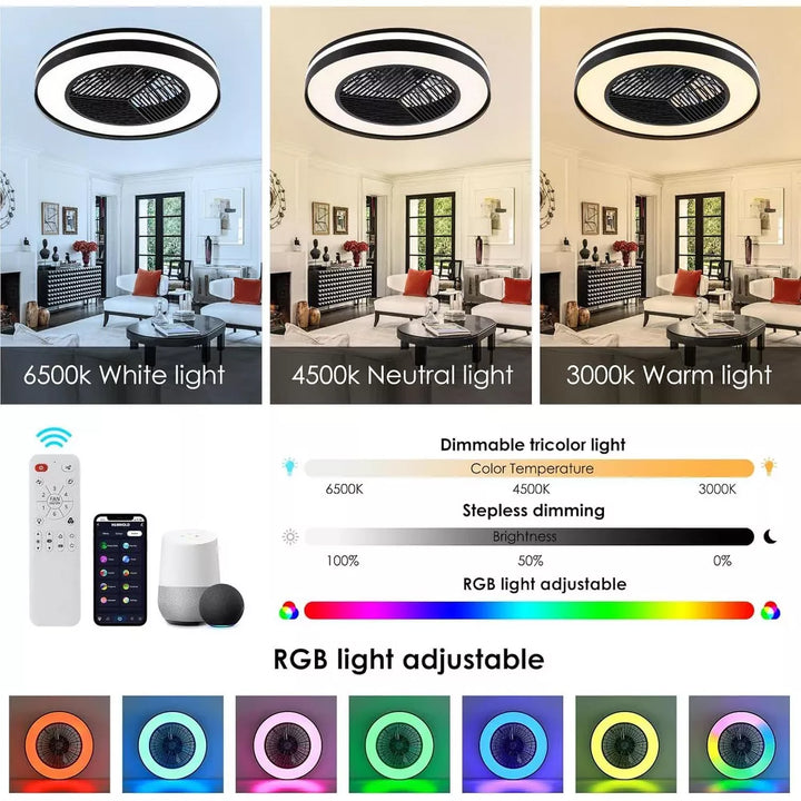 Experience a whole new level of interior design with this enclosed ceiling fan that features RGB lights. Create a dynamic and modern atmosphere with a variety of colors that will impress your guests. From monochrome mode to cyclic lighting mode, enjoy party, disco, and stage lighting right in your own home. With the convenient APP application, personalize your light color and scenario to music rhythm. This is a revolutionary way to enjoy your living space!