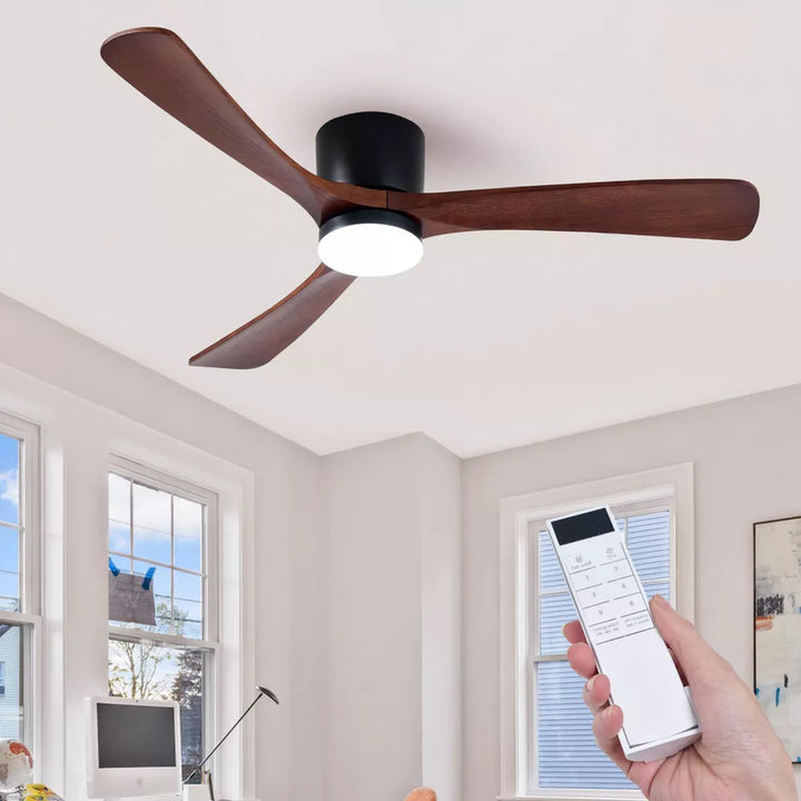 Matte black metal motor housing and 3 walnut-colored wooden fan blades for a more modern look. Acrylic cover with flicker-free LED light source to soften the light. The flush mount ceiling fan has 6 wind speeds, (2H/ 4H/ 6H) timer. 3 walnut wood blades are carved from wood that has been grown for over 10 years. Avoiding the formaldehyde pollution of industrial synthetic fan blades, it is more suitable for families with babies, the elderly, or newly renovated homes. Each blade is reversible as well as the motor housing, further enabling it to not only cool during the summer but help warm up during the winter.Offering a timeless look, adequate air flow and superior quality, you’ll be able to rely on this fan for years to come. Perfect for your living room, bedroom, study room, terraces, office, multi-person room, coffee room, garden, conference room disply, balcony, gym, porch, patio, restaurant and farmhouse.