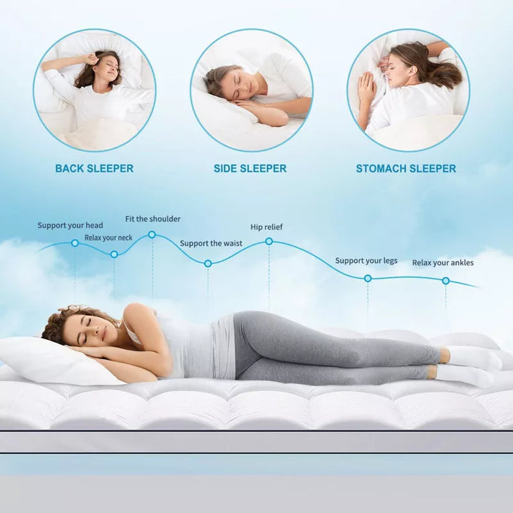 2 In 1 Adjustable Dual Layer Design - This plush dual layer mattress topper features a 2-inch cooling gel memory foam and a 2-inch quilted breathable pillow top mattress topper with snow down alternative overfilling. When combined, it can become a 4-inch thick mattress topper, which not only has strong support, but also provides a cloud-like comfortable experience.