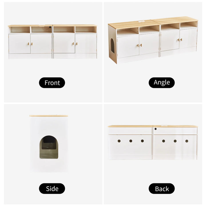 This four doors cat litter box enclosures is composed of two large cat litter box, which have a large usage space, it can accommodate a large litter box, litter bed, cat food bowl and other items to use as a litter box, lounge or eating space for your cat. In addition, there are winding cat holes on both sides and in the middle partition of the cat's nest, facilitating the entry and exit of cats and ventilation. This product has a classic color design that complements any indoor color palette.