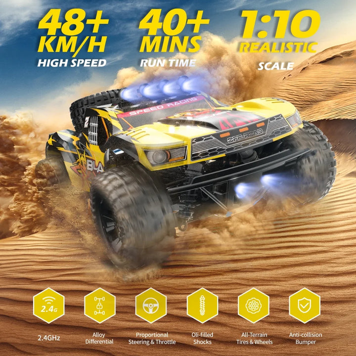 HIGH-PERFORMENCE MOTOR - Built-in powerful motor rips out of the turn and has the speed to impress on the straightaways. The full speed can reach up to 35+MPH. With heat sink on it; maintain good performance while prolonging its service life.