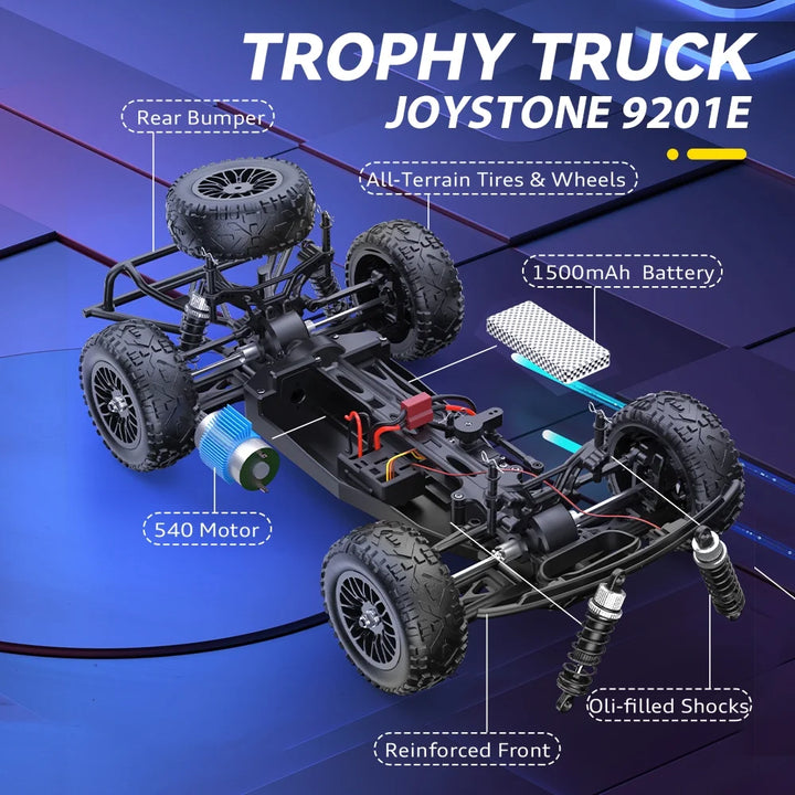 1:10 HIGH-SPEED RC CAR - Large scale fast RC car outfitted with the powerful 540 brushed motors, reinforced bumpers, LED lighting system, and all-terrain tires take on any high-flying and all-weather adventure you can throw at it. Grab your transmitter, rip some 4-wheel roost, and discover why nothing else is built like a JoyStone RC CAR!