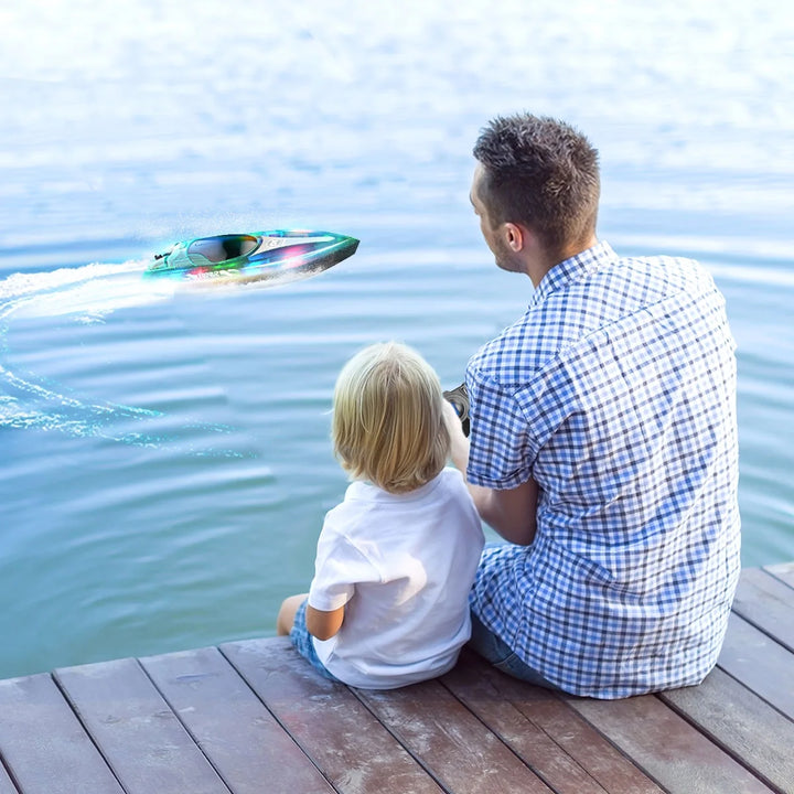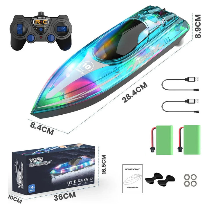 - RC BOAT WITH COLORFUL LED LIGHTS - With bright and colorful LED lights underneath the transparent cover,this remote control boat for kids and adults is more unique and attracting. The sufficient lighting not only bring more funny experience, but also facilitate night racing. You could identify the heading direction easily. Let the bright colors fly in the waves!