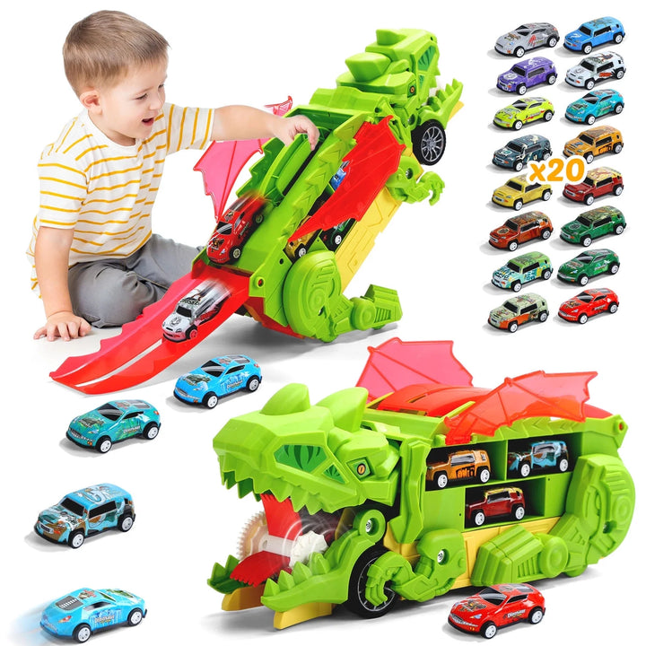 - 【3-in-1 Dinosaur Truck Adventure】Push our dynamic dinosaur truck toy and watch it gobble up cars as it rolls along! Transform it into a mighty triceratops and ignite racing excitement with two sliding tracks. Equipped with 20 vibrant mini cars and ample storage space for even more, this dino transporter sparks imaginative play, boosts hand-eye coordination, and encourages interactive fun. With its sturdy design and portable handle, kids can take the excitement anywhere—perfect for playdates, road trips, or backyard adventures!