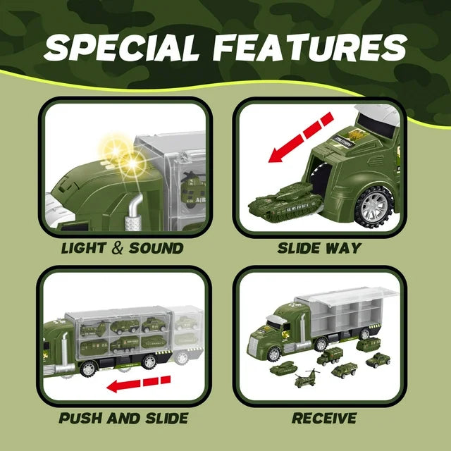 - 【33-in-1】12 mini military trucks toy set in one delivery truck with different designs and functions. It also includes 8 roadblocks, which are more realistic and interesting, including 12 special plastic soldier figures, helicopters, tanks, armored vehicles, long trucks, hovercrafts, pickup trucks, etc.