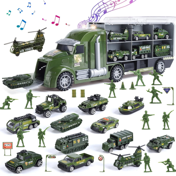 JoyStone 33 in 1 Military Truck Toy, Green Army Toy Set with Soldiers and Roadblocks, Mini Battle Truck Toy in Carrier Truck with Lights and Sounds, Gift for Toddler Boys Aged 3+