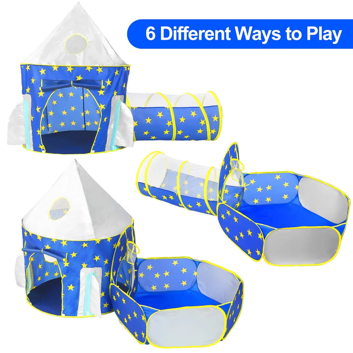 The space world Theme 3 in 1 baby ball pit is designed for kids.The Rocket Ship Play Tent is big enough for your young one to share it with their siblings, friends and stock their playing toy supplies for ultimate group fun.The fort tent, pop up tunnel, &baby ball pit are folded separately & packaged inside a compact zipper storage case with handle. It can be used wherever indoors or outdoors, any place you want your kids to play.Perfect for indoor or outdoor use in the backyard, parks, playground, daycare, preschool, nursery, playgroups.