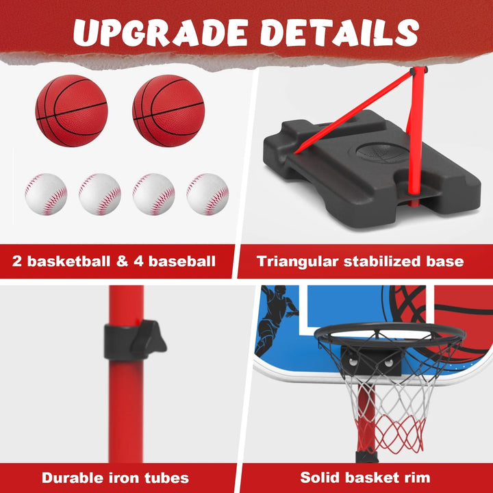 - Easy to Assembly: This kid's basketball hoop set includes a 2-in-1 height-adjustable basketball hoop, 2 mini basketballs, 4 sticky baseballs, 1 baseball bat, 1 ball launcher, 1 durable basketball net, and 1 convenient air pump for quick inflation. No additional tools are required! Easily complete the assembly and play immediately!