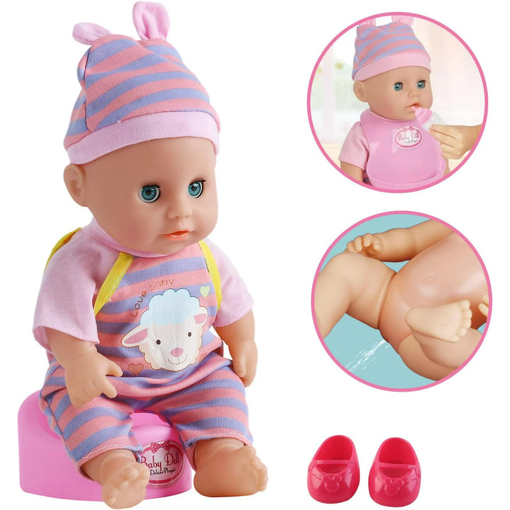 - 41PCS Soft Baby Doll Playset: The set includes a 12-inch baby doll x1, mini crib x1, mini baby high chair x1, toy mini pillow x1, clothes x2, baby rattle accessory x1, milk bottles x2, toy pacifier x1, donuts x2, baby shoes x1, toy baby cradle x1, toy potty x1, toy diaper x1, toy bib x1, building blocks x3, yellow duck x1 and 4 toy tableware.