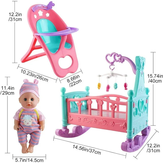 - Interective Pretend Play: The 12-inch doll comes with two sets of beautiful clothes for replacement. The clothes can be taken off for normal washing. The baby doll crib can rock the doll to sleep. The doll can sit in the high chair and be fed with a feeding plate and spoon. The doll's hand-cranked toys are real.