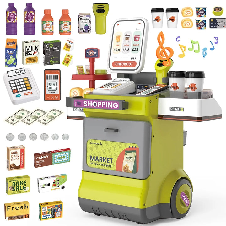 JoyStone 48PCS Pretend Play Cash Register Toy with Light and Sound, Pretend Calculator, Scanners, Credit Cards and Mobile Cart, Preschool Gifts for Toddlers for Boys and Girls, Green