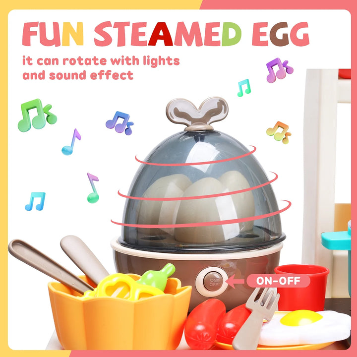 - Kids Pretend Kitchen Toy - 63-Piece Play Kitchen Accessory Set included electronic stovetop,play sink with running water, Egg steamer, Mini blackboard and kinds of kitchen accessories.Various cooking utensils for your little one to have countless hours of fun and play.