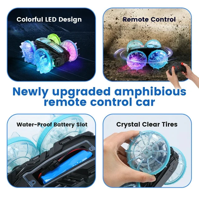 Dive into endless water fun without worries! Our amphibious remote control car boasts a waterproof body and remote control, ensuring protection against water damage. Enjoy seamless control and endless fun, whether on land or in water. With captivating LED lights shining through transparent wheels, the car looks even more impressive. The RC car is packed with one rechargeable battery.It will extend the driving time up to 60+ minutes which depends on the operation.Made of non-toxic ABS with waterproof design, offers you thrilling and unforgettable driving experience.Double sided and amphibious RC car, work well on land and water; Designed to perform front flips and back flips and 360-degree spins.Can work on land, sandy beach, wetlands, grasslands and even water.