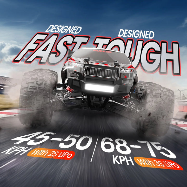 45A Brushless ESC Receiver(3S 11.1V Battery Max) & TWO Speed Radio System - The ultra monsters buggy cars with a system featuring its 45A ESC receiver is compact,lightweight and waterproof.Precision engineered for maximum energy conversion to support 3S 11.1V battery (discharge rate is less than 25C?. Equipped with a professional RC transmitter, new bashers will be able to set throttle limits at 70% or 100% .Fast, rugged and factory-buil. features highly responsive steering and throttle. You can race with your friends or kids at the same time.