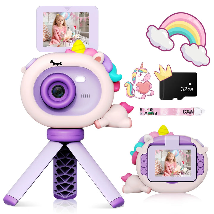 - 【Innovative Selfie Design】Our toddler digital camera features a 180° flip-up monitor and tabletop tripod that doubles as a selfie stick.It's an upgrade kids selfie camera, children can enjoy expressing themselves and share their creations with friends. Proudly share their world from their perspective with this innovative feature everyone will love.A mini camera for kids that truly allows them to shine!