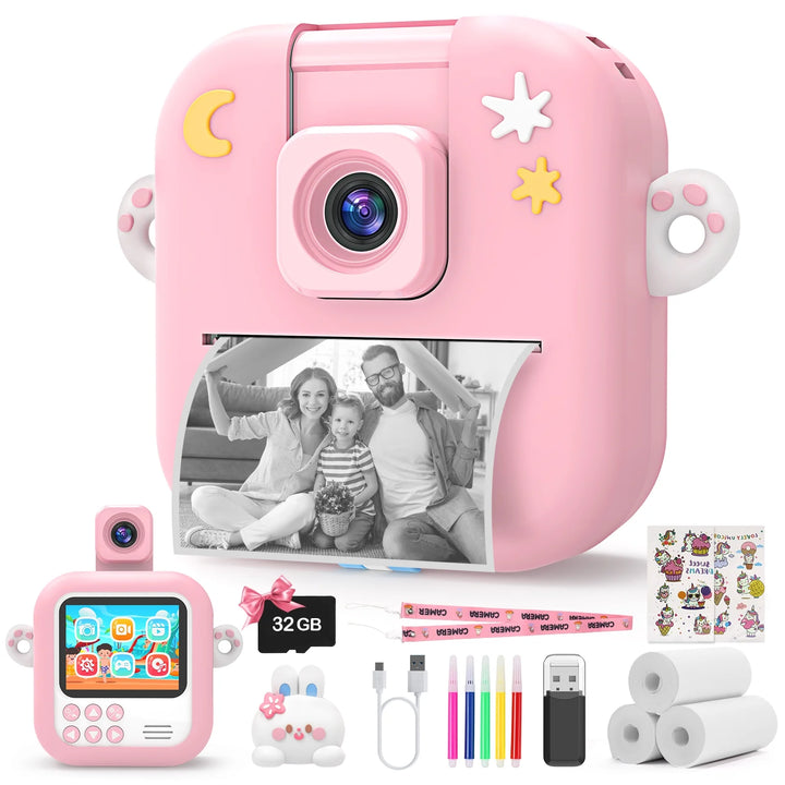 - 【What you will receive】Decorate the cover of your digital camera! 2 rolls of printer paper, or instant film, allow kids to print photos! A 32G SD card allows children to save more than 1,000 pictures! You can use a card reader to read photos/videos on your memory card! The disposable camera comes with 5-color pens and a lanyard, so kids can draw creatively on the printing paper! The kid-friendly compact camera comes with a cute sticker sheet that might get your kids excited because they can decorate their own camera!