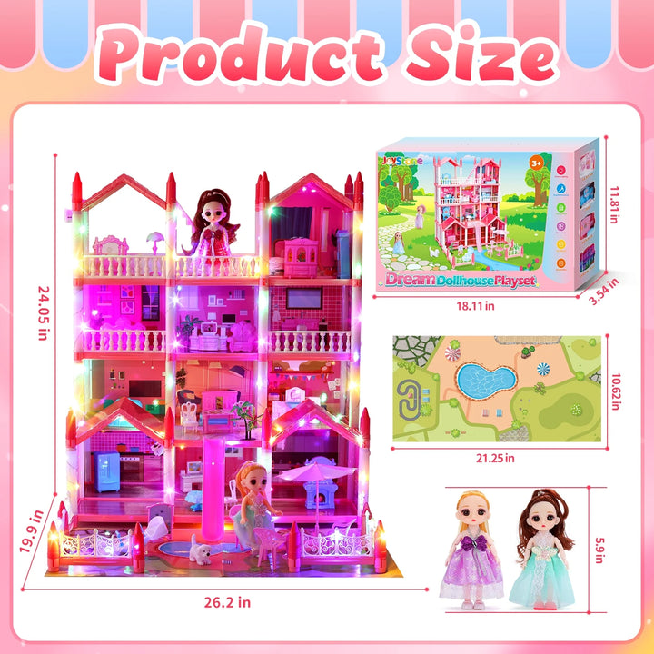 JoyStone Play Dollhouse with Doll Toy Figures, 14 Rooms Furniture and Colorful Lights, Creative Doll House Gift for Girls Ages 3+, Assemble Required, Pink