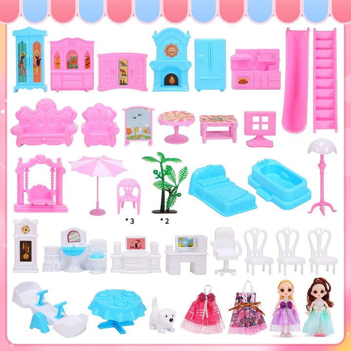 - 24-inch Girl Dollhouse - There are 14 rooms, 24 inches in size, divided into bedrooms, kitchens, dining rooms, bathrooms, living rooms, study rooms, piano rooms, etc. This dollhouse set can improve children's hands-on ability and bring a large-scale playhouse experience. It is a great toy gift choice for birthdays, Christmas and Easter!