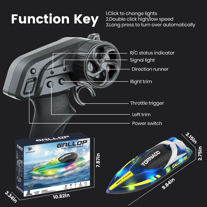 The JoyStone RC boat2.4G 15+ MPH Fast Remote Control Boat with LED Lights is packed with 2 * 3.7V 1200mAh high quality batteries, it will extend the driving time up to 240 minutes which depends on the operation. Use a transparent boat cover with red blue and green cool LED light stripes under the cover to optimize lighting, which makes your RC boat more unique and attractive. Facilitate night racing! With double motor and double propellers, It's much easier for players to control the direction of this remote control boat. Even beginners can learn how to control the rc toy boats after several tries. When the remote control signal is weak, the remote control will sound an alarm.