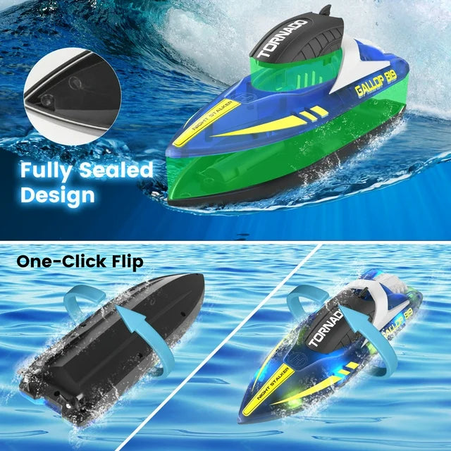 - 【RC Boat with LED Lights】The high-speed remote control boat is equipped with 10 bright LED lights at the edge, which can be set to two lighting modes—always on and flashing.The bright LED lights not only look very cool in the dark night, but also allow you to clearly distinguish the position and direction of the remote control boat,allowing you to engage in thrilling competitions in the water even at nights.