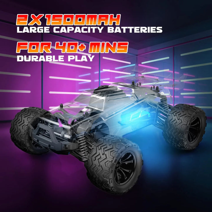 - 2 Rechargeable Batteries For Extended Running Time: Equipped with 2 rechargeable batteries. You can enjoy the fun of driving for about 40+ mins a time with this remote control car which is longer than other high-speed remote monster trucks.