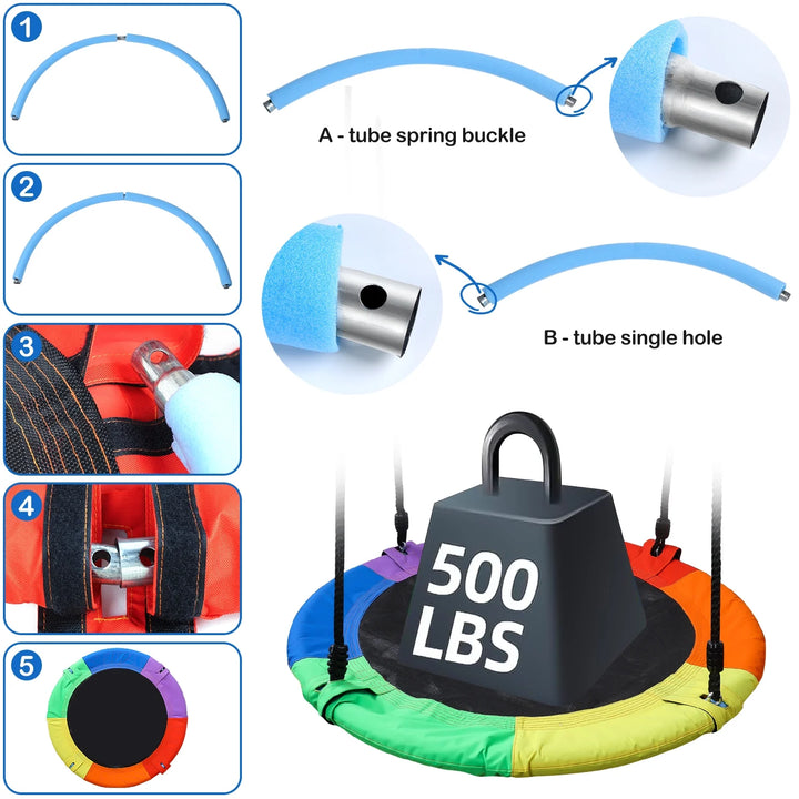 - Our saucer tree swing is made of high-quality Oxford fabric, with a galvanized iron pipe support structure inside. The capacity weight is 550 pounds.