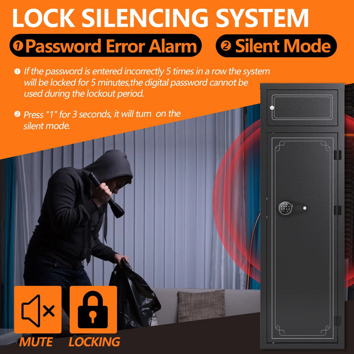 - [The Details of Gun Safe] : 3 Removable gun racks. Can be freely adjusted according to the length of the gun. LED light. when you use the password to enter the gun cabinet, the LED light will light up. Use the key to enter the gun cabinet and the LED light will not light up. Silent function. Long press "*" to switch between silent and non-silent modes.