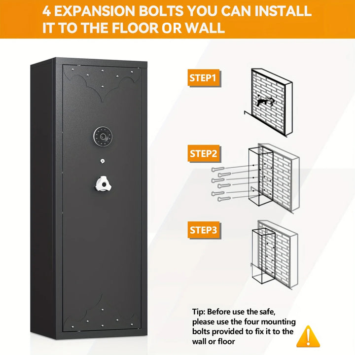 Discover the ultimate firearm storage solution with our high - capacity gun safe. Measuring H55.11” X W19.68” X D15.1”, it offers ample space, accommodating 10 - 12 long guns, 4 pistols, and ammunition. The adjustable rack fits guns of various lengths. Crafted from sturdy cold - rolled steel with a 3mm anti - pry steel door, solid locking bolts, and concealed hinges, it ensures top - notch security. Set two passwords, and an alarm triggers on consecutive wrong entries. Its stylish stamped and riveted door panel complements any setting. Enjoy quick access via password, emergency key, or external battery box, with a handy magnetic sensor light. Easy to assemble and mount, it’s your reliable choice for firearm safety.
