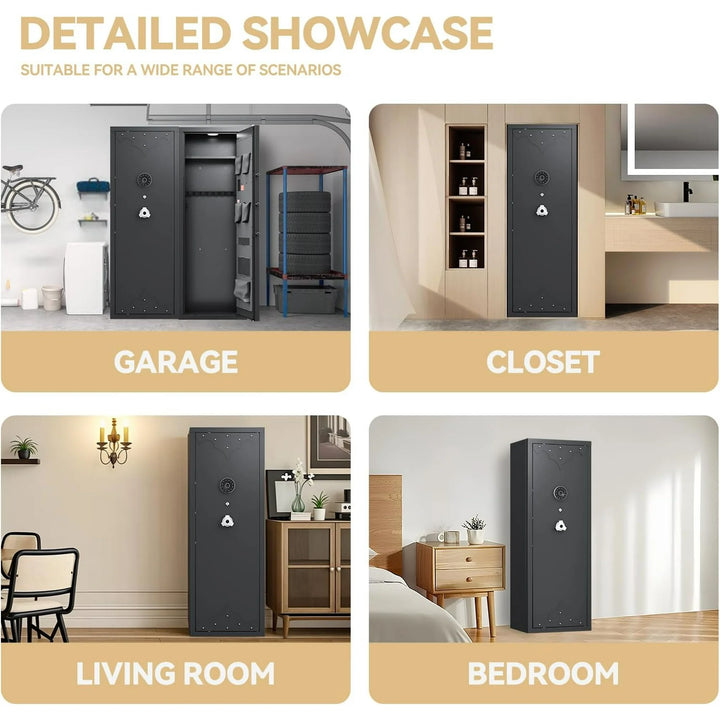 - [Large and Adjustable Storage Space] Gun safe product size: H55.11” X W19.68” X D15.1”. Our gun safe have more storage space than other products. This gun safe can hold 10-12 long guns and 4 pistols as well as various ammunition at the same time. You can adjust the position of the rack to store guns of different lengths.