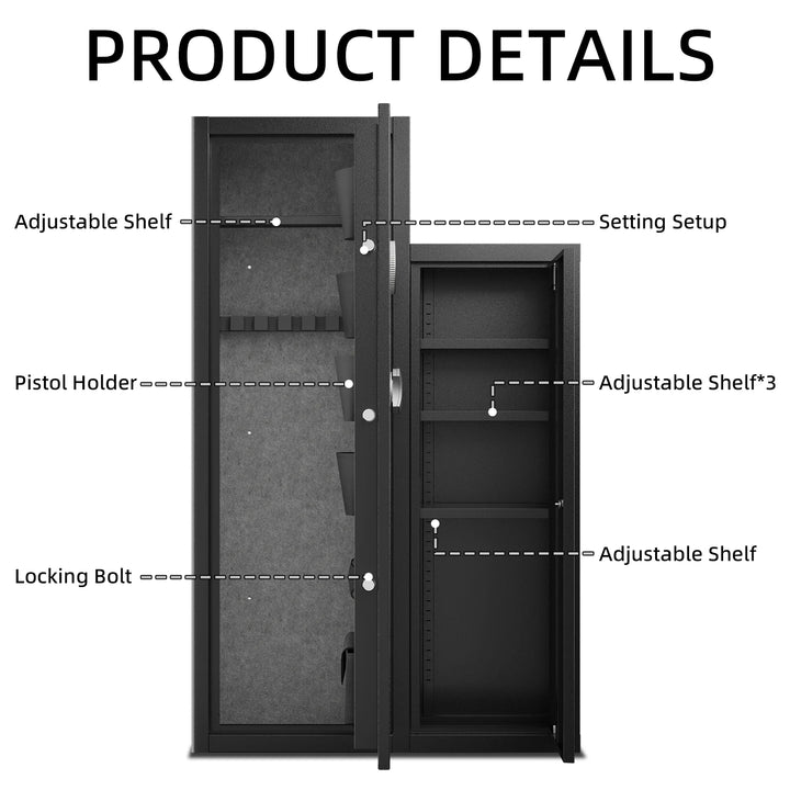 - 【Gun Safe with Gun Storge Cabinet】:This gun cabinet consists of 2 parts, the left is a gun cabinet (assembled) for storing rifles or shotguns, and the right is a storage cabinet (needs to be assembled) . can be used to store bullets, handguns,scopes, gun accessories or cameras and so on.{NOTE: You need to connect the right to the left, and the storage cabinet on the right needs to be assembled.The left gun cabinet is already assembled. Express package: The right cabinet is inside the left cabinet}