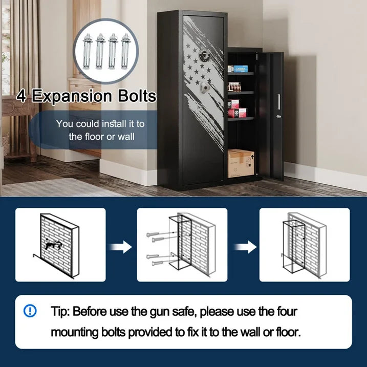 - 【Choose Us】: You will receive a large 8-guns gun cabinets and one ammo locker. Larger capacity and unique design.Accessories include: 1xInstruction manual, 4xExpansion bolts, 1xExternal battery box,2x Keys, 1xScrewdriver, 1xGloves, Screws and nuts.After you receive the gun safe,if you have any problem about our product,Please contact us by email immediately.