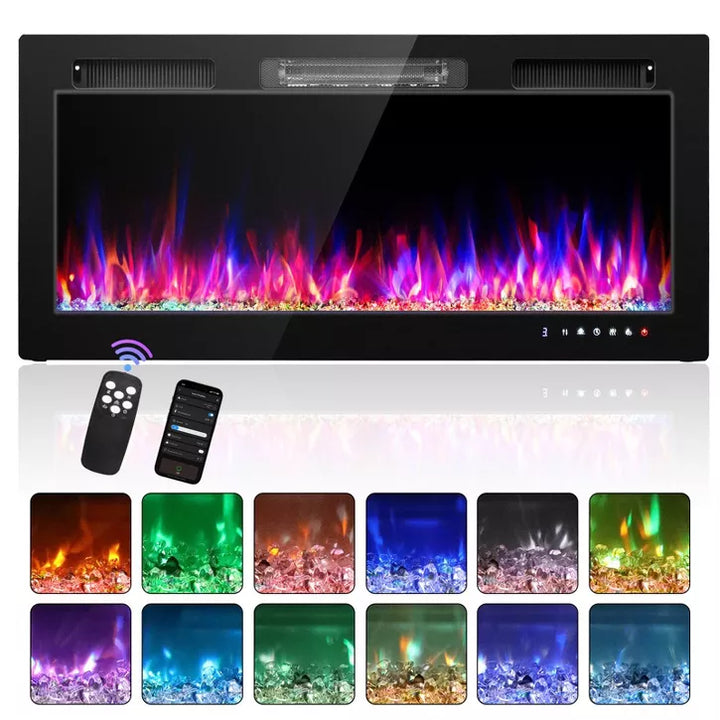 Bring warmth, style, and smart technology into your home with the 36-inch Electric Fireplace Insert. This versatile fireplace offers modern convenience with multiple control options, including a WiFi-enabled app, remote control, and intuitive touch panel, allowing you to easily adjust temperature, flame colors, brightness, and more from anywhere. Designed to fit seamlessly into any space, this 1500W heater can be wall-mounted, recessed, or used as a freestanding unit. With 12 color flame options, 5 brightness settings, and overheat protection, this fireplace offers the perfect blend of functionality, ambiance, and elegance, transforming your living space into a cozy retreat year-round.